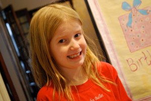 Last night, we celebrated Ellie’s birthday with her first “friend” birthday party. Seven girls, plus our four, flooded our home with squeals and silliness for two hours. In what I think is a phenomenon fairly unique to home schooling, Ellie’s guest list was primarily girls her sisters’ ages. One little girl younger than her was invited, but couldn’t make it. Two her age were here, and everyone else was older, on up to 6th grade. I’m especially thankful for those older girls coming, as Ellie simply adores them and it made her week.